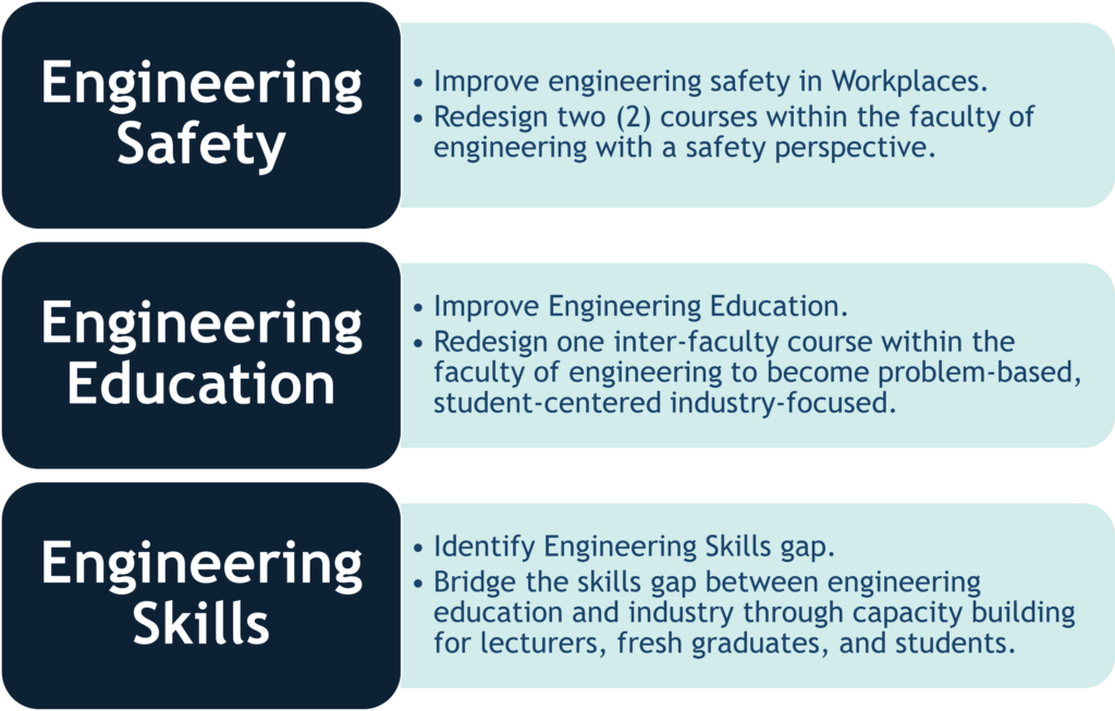 - Bridge the skills gap between engineering education and industry through capacity building for lecturers, fresh graduates and students.
